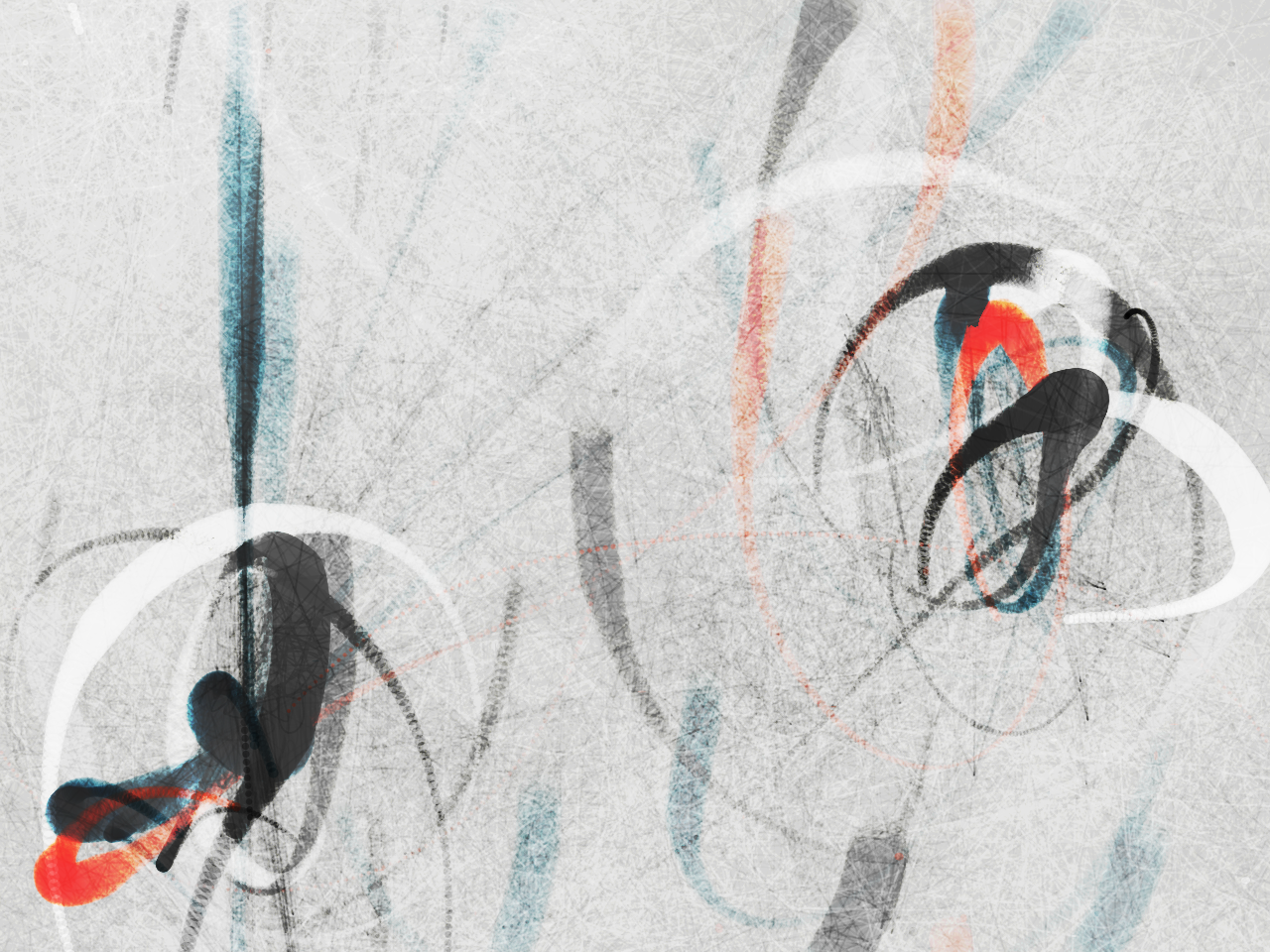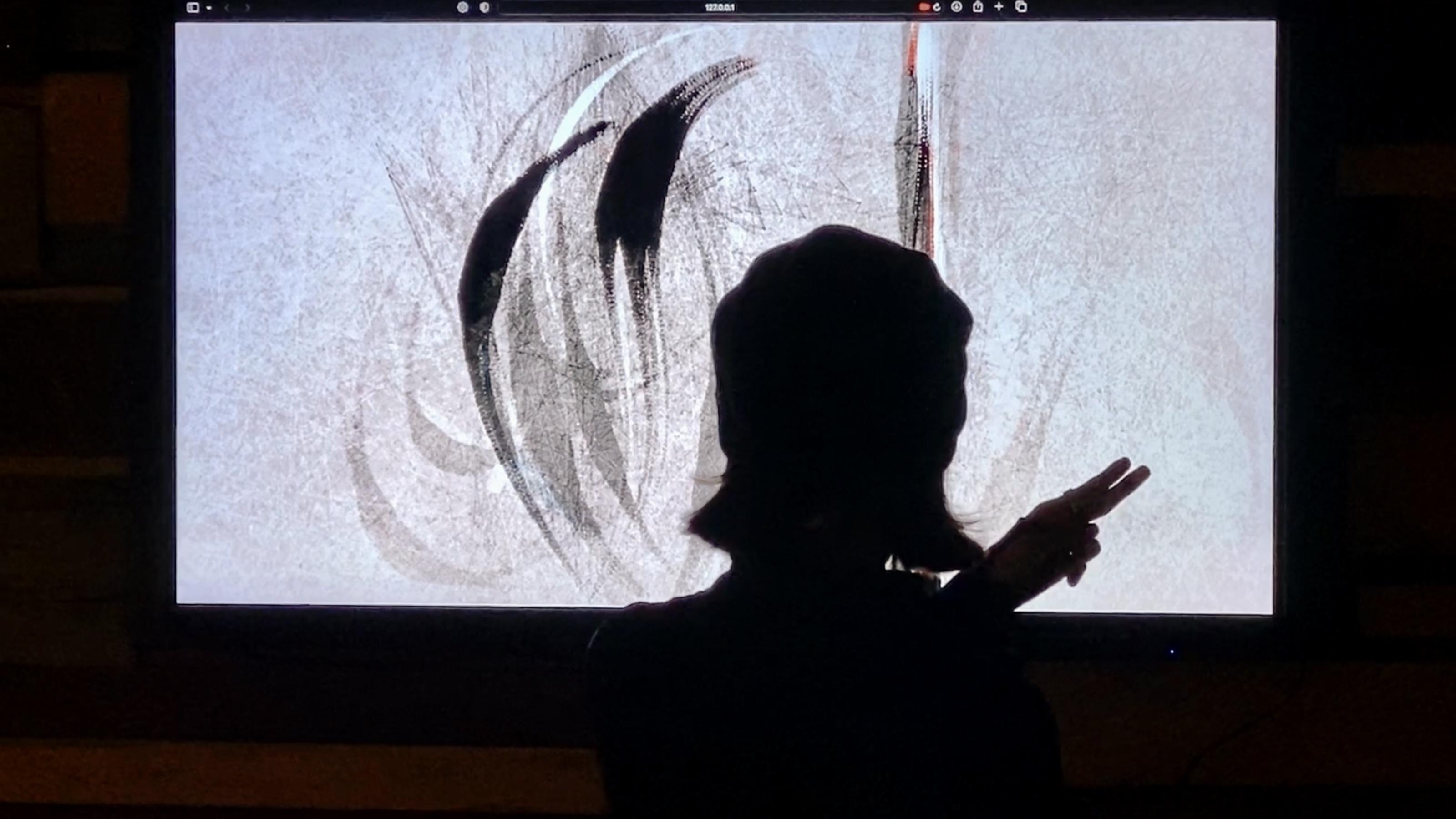 This is a piece of body interaction programming art, when it monitors the performer's hands, the screen generates a kind of ink dot similar to Chinese brush calligraphy. The movement of the performer's hands follows a path like the ink falling on rice paper. the force of the performer's hand movements and the reality of the ink shaping the image can be fed back from the screen.
